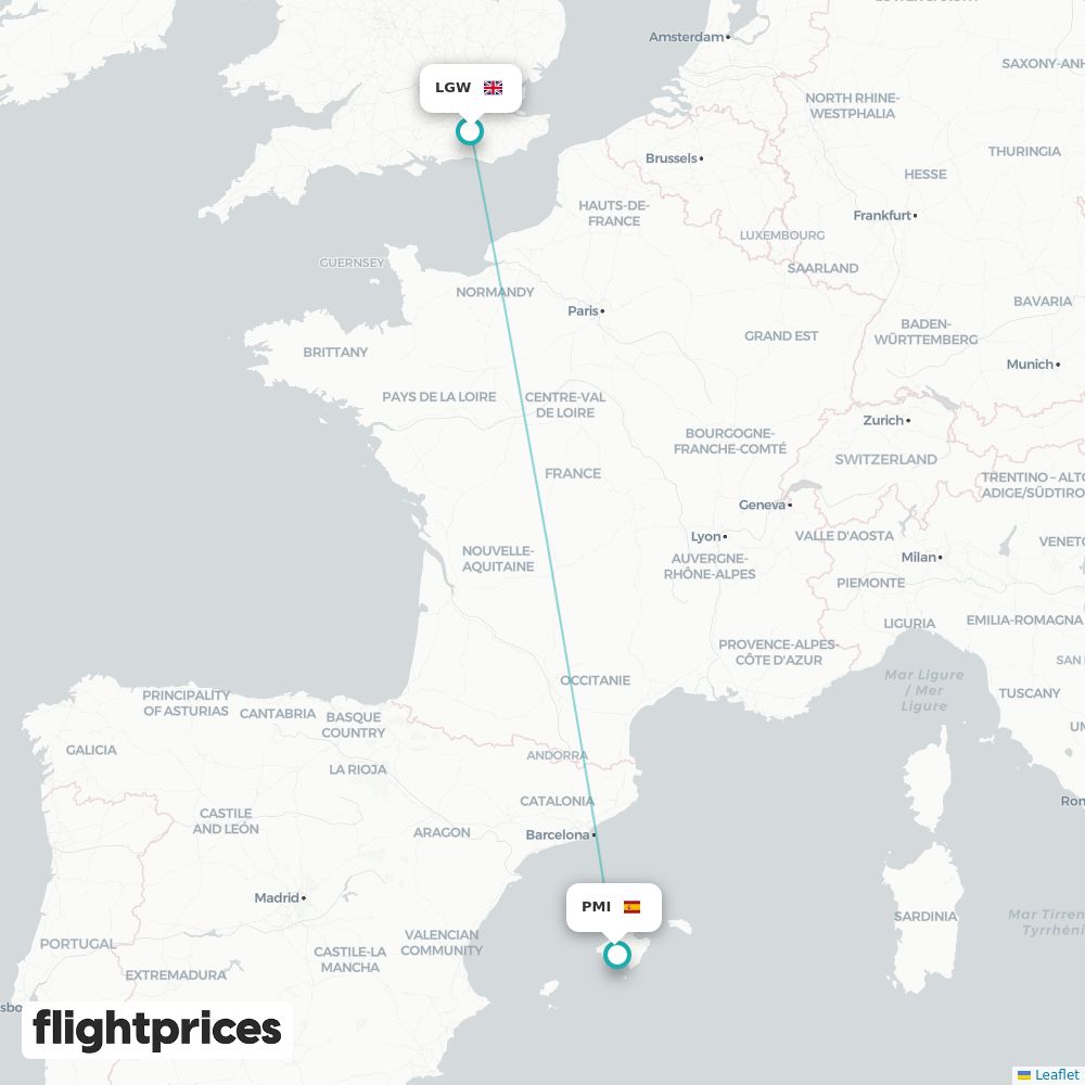 A quick snapshot of London (LGW) to Palma de Mallorca (PMI) fares — lowest and typical prices plus the cheapest months and weekdays to fly, the airlines on the route and the usual duration for travel from United Kingdom to Spain.
