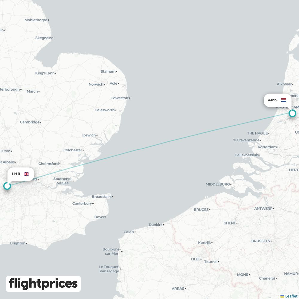 A quick snapshot of London (LHR) to Amsterdam (AMS) fares — lowest and typical prices plus the cheapest months and weekdays to fly, the airlines on the route and the usual duration for travel from United Kingdom to Netherlands.