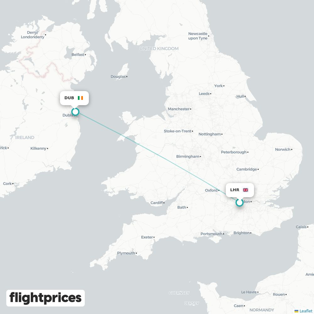 A quick snapshot of London (LHR) to Dublin (DUB) fares — lowest and typical prices plus the cheapest months and weekdays to fly, the airlines on the route and the usual duration for travel from United Kingdom to Ireland.