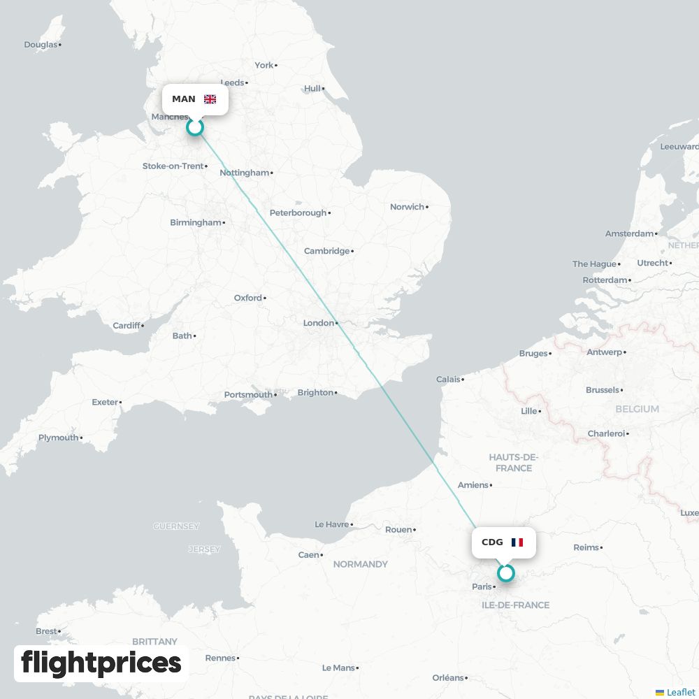 A quick snapshot of Manchester (MAN) to Paris (CDG) fares — lowest and typical prices plus the cheapest months and weekdays to fly, the airlines on the route and the usual duration for travel from United Kingdom to France.