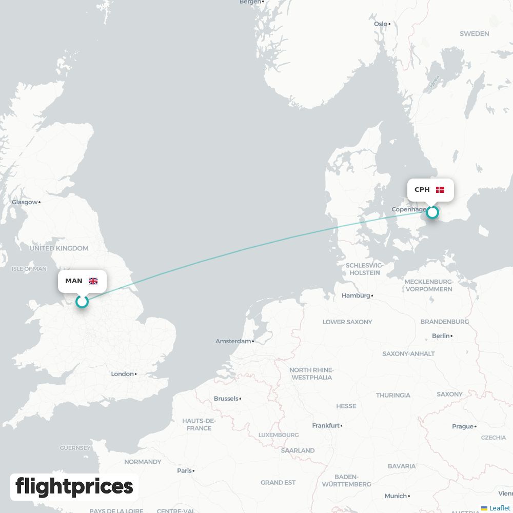 A quick snapshot of Manchester (MAN) to Copenhagen (CPH) fares — lowest and typical prices plus the cheapest months and weekdays to fly, the airlines on the route and the usual duration for travel from United Kingdom to Denmark.
