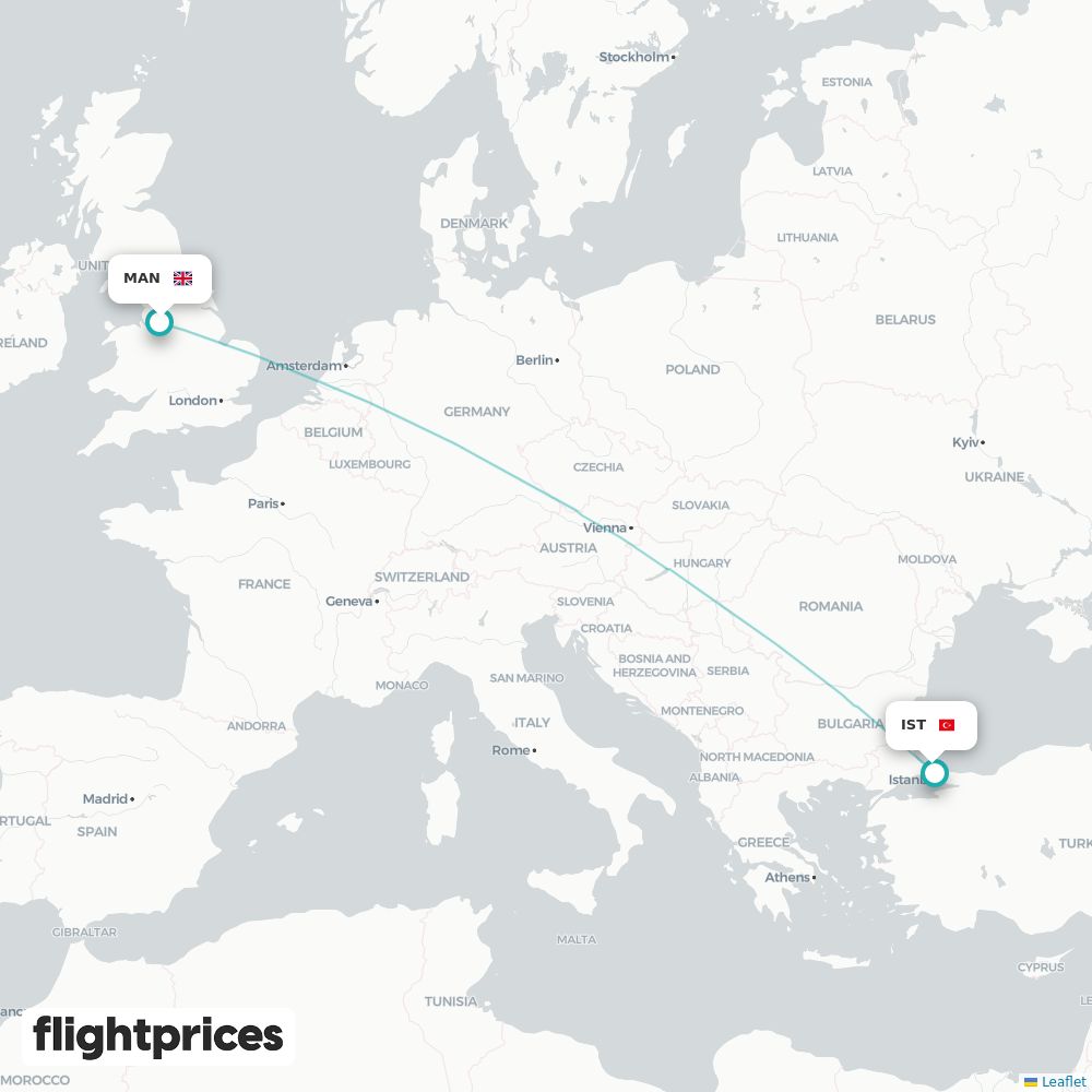 A quick snapshot of Manchester (MAN) to Istanbul (IST) fares — lowest and typical prices plus the cheapest months and weekdays to fly, the airlines on the route and the usual duration for travel from United Kingdom to Turkiye.