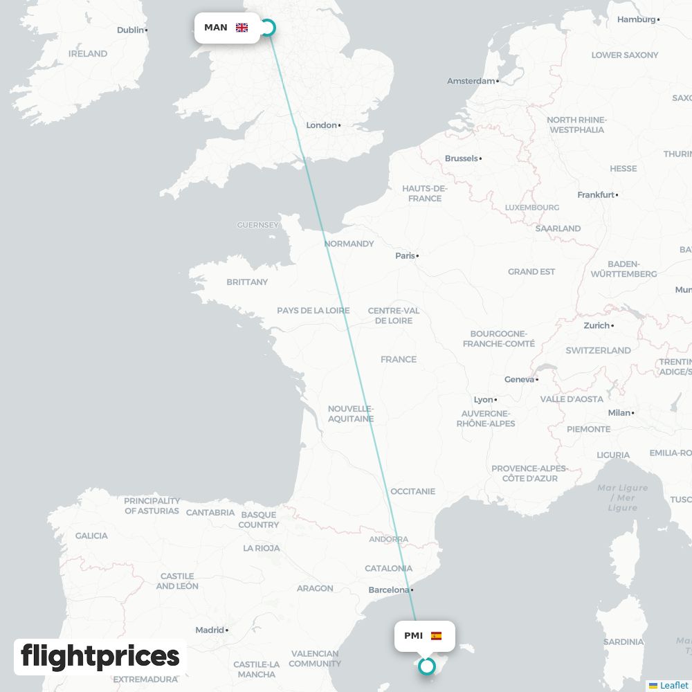 A quick snapshot of Manchester (MAN) to Palma de Mallorca (PMI) fares — lowest and typical prices plus the cheapest months and weekdays to fly, the airlines on the route and the usual duration for travel from United Kingdom to Spain.