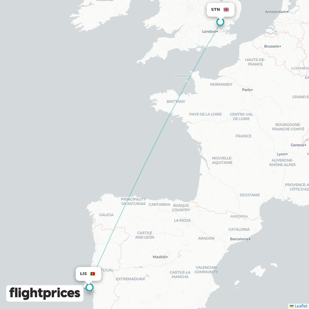 A quick snapshot of London (STN) to Lisbon (LIS) fares — lowest and typical prices plus the cheapest months and weekdays to fly, the airlines on the route and the usual duration for travel from United Kingdom to Portugal.