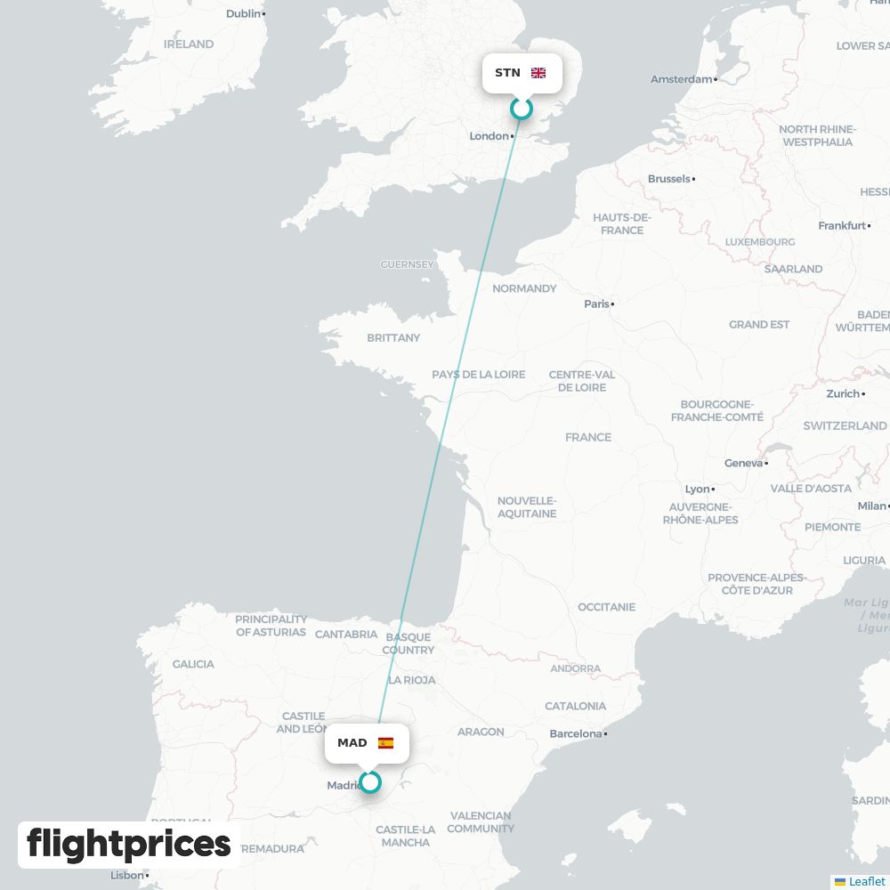 A quick snapshot of London (STN) to Madrid (MAD) fares — lowest and typical prices plus the cheapest months and weekdays to fly, the airlines on the route and the usual duration for travel from United Kingdom to Spain.